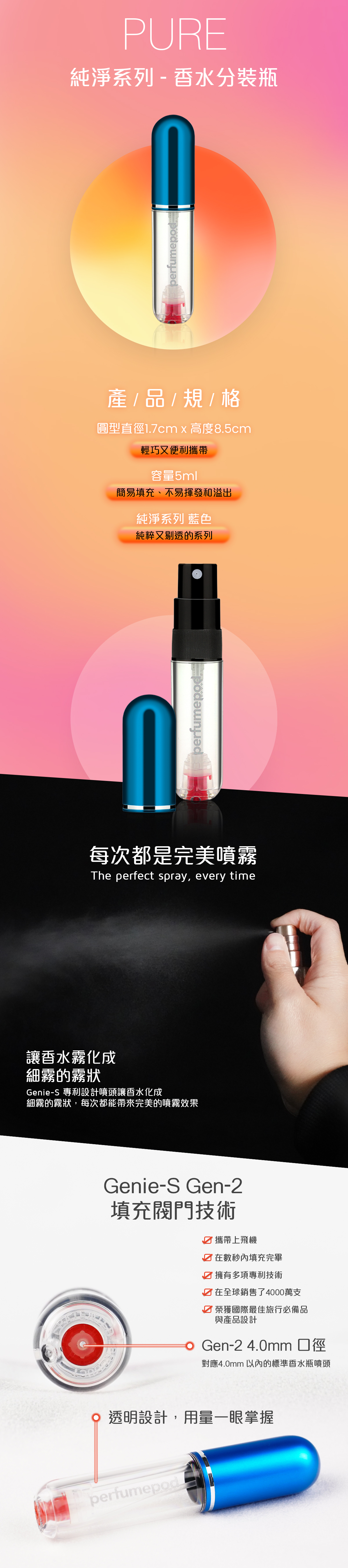Perfume pod 能短時間內將香水從原裝瓶中轉移到完全密封防漏的噴霧器中